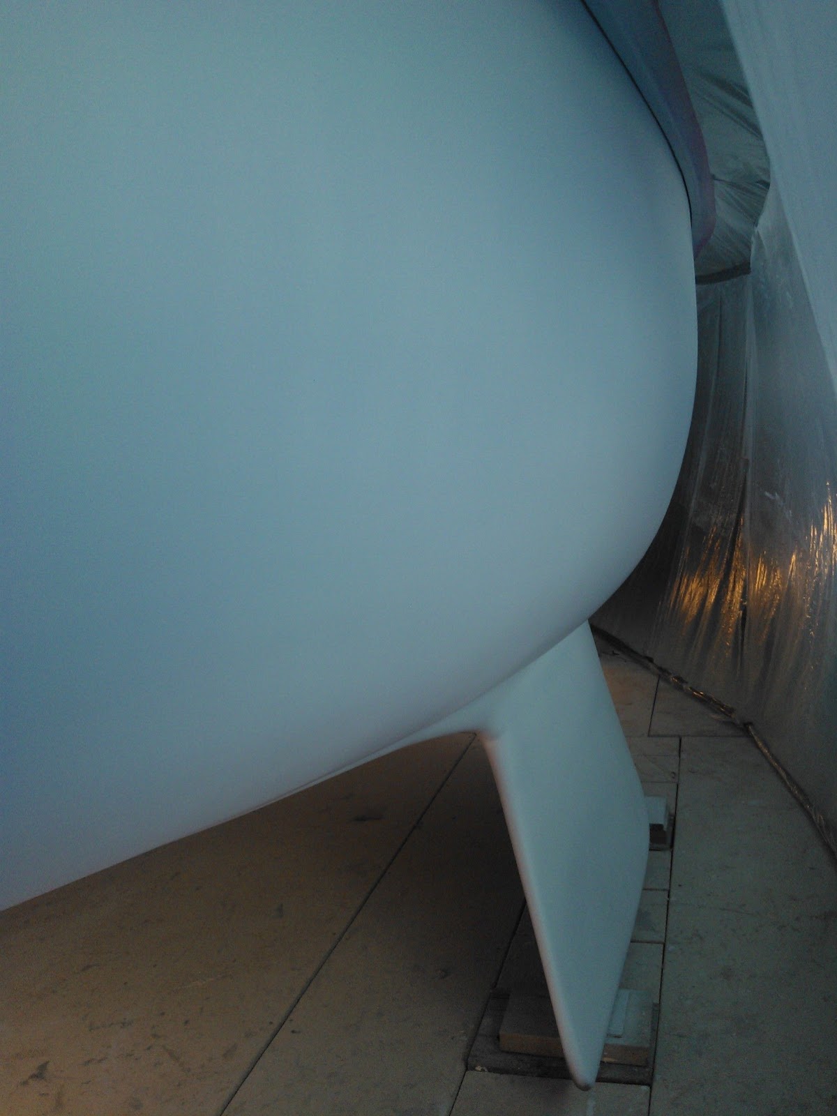 I'm known in my family for my impatience - to some its annoying to others its plain stupid, after what seemed like an eternity I did a tester patch thinning some 10%. Not seeing anything wrong with what i had just sprayed and being terminally bored with the weather i thought fuck it, man up, mask up and get the paint on. It went like clockwork, my now well rehearsed dropping of the vertical shroud went without a hitch too. After the last hit on the starboard bow I put the gun into soak closed the boat off and whacked the heaters on.