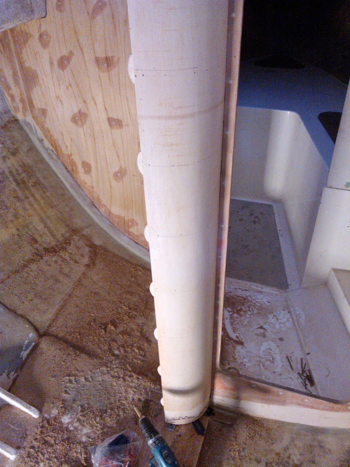 Curiously Westerly fitted the old compression post offset to starboard on a 6" long piece of 4"x2" via a piece of softwood glassed in inside the dinette module. Thinking of the increase in loads from the increase in sail area; i don't want any hiccups so ran out a load of oak and profiled each piece to the contours of the bilge then bedded on a super thick cabosil bog - pushed it in then scraped away the excess.