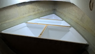 Which brings me to the work at hand - namely tabbing the ply bulkhead, for this i went three layers of 600g bi-ax cloth on a cabosil-thickened epoxy, i should say firstly i filleted the joint properly with a dense cabosil mix. Oh yeah before i forget - piping bags - another epiphany - god they cut the mess to zero, just started using disposable ones - I almost look professional now when i work.